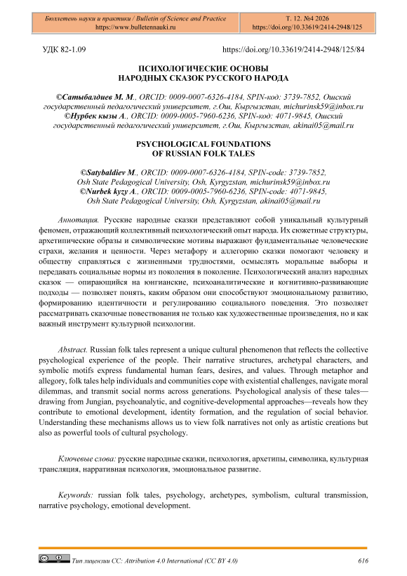 Русские народные сказки, психология, архетипы, символика, культурная трансляция, нарративная психология, эмоциональное развитие