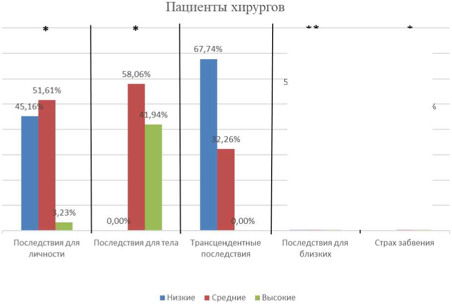 По результатам исследования выявилось, что пациенты хирургов чаще задумываются о последствиях, связанных с телом и личностью, чем пациенты терапевтов, что обусловлено наличием опыта хирургического вмешательства в свое тело.