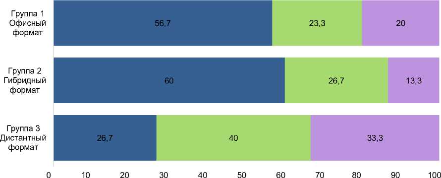 Методология и методы . Исследование проводилось на базе некоммерческой организации г. Москвы. В нем принимало участие 90 человек (N = 90), работающих в одной структуре и разделенных на три группы по формату занятости: полностью дистанционная работа, гибридная работа и офисный формат. В каждой группе было по 30 человек в возрасте от 20 до 45 лет. Все они заняты в сфере интеллектуального труда и используют цифровые технологии в ежедневной профессиональной деятельности.