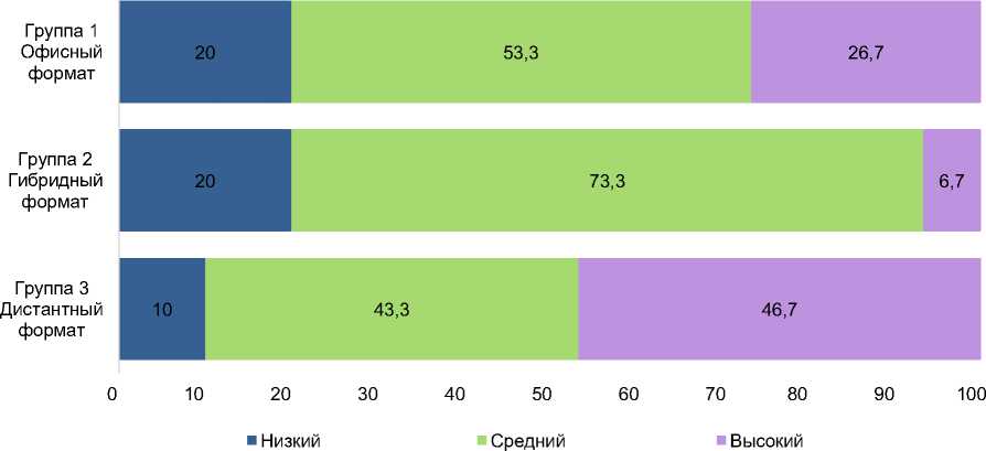 Результаты исследования . Выраженность эмоционального выгорания у сотрудников с различными формами организации труда в распределении по трем уровням – низкому, среднему и высокому – представлена на рисунке 1. Графическая картина демонстрирует принципиально различающиеся профили состояния персонала в зависимости от формата занятости: для офисной и гибридной групп характерно доминирование низкого уровня выгорания, тогда как в дистанционной группе резко возрастает доля сотрудников со средним и высоким уровнями выгорания. На уровне описательной статистики мы видим, что дистанционный формат в рассматриваемой выборке сопряжен с большей психологической уязвимостью: доля работников с низким уровнем выгорания здесь составляет лишь 26,7 %, что практически вдвое меньше, чем в офисной и гибридной группах.