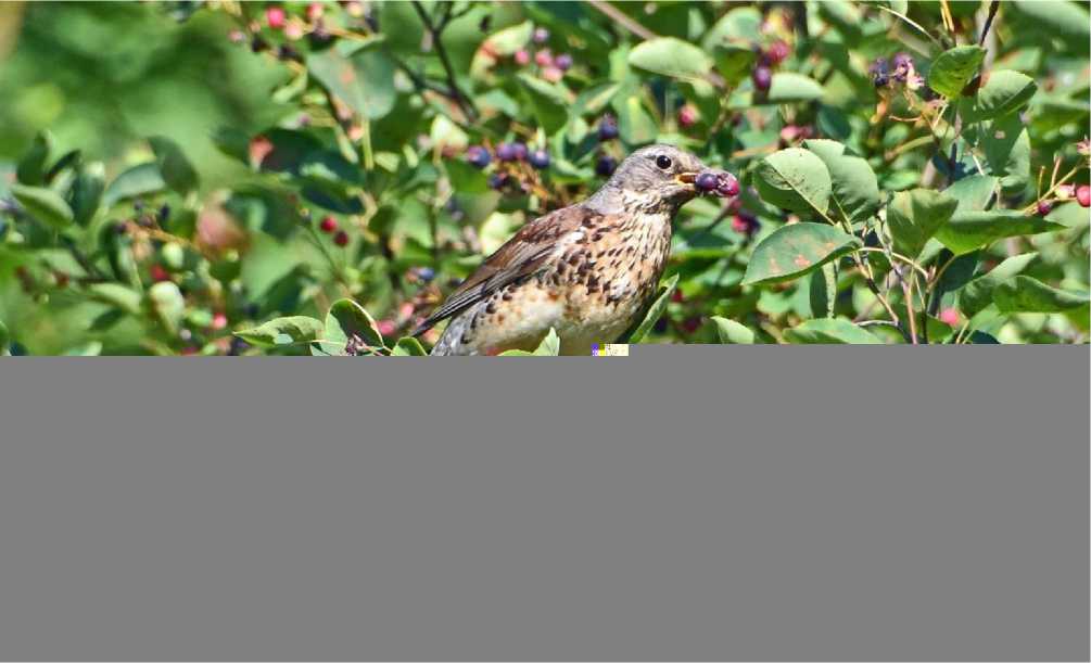 Рис. 2. Рябинник Turdus pilaris ест плоды ирги. Парк Александрино. 16 июля 2025. Фото автора