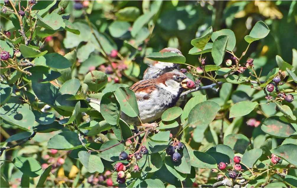 Рис. 10. Домовые воробьи Passer domesticus едят плоды ирги. Александрино. 16 июля 2025. Фото автора