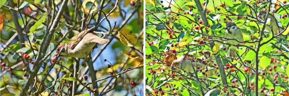 Рис. 11. Полевые Passer montanus и домовый P. domesticus воробьи едят плоды ирги. Парк Александрино. 18 июля 2025. Фото автора
