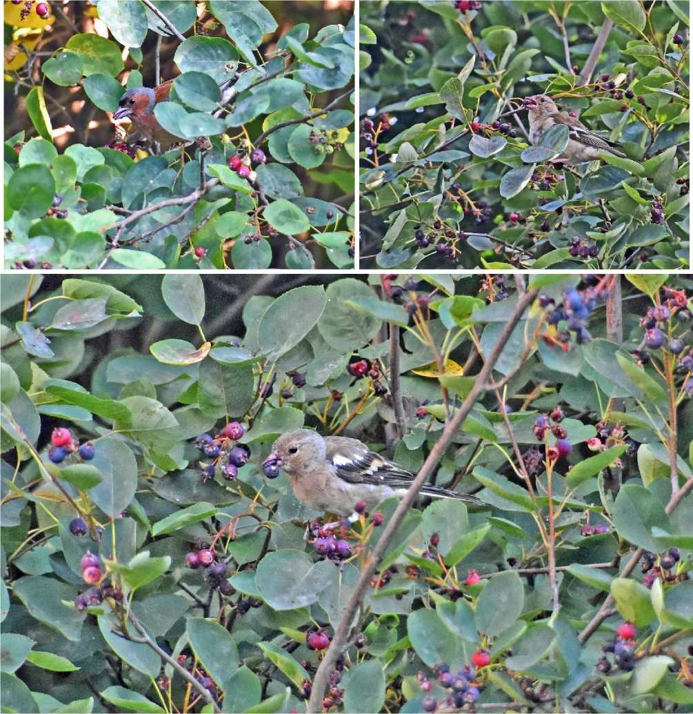 Рис. 12. Зяблики Fringilla coelebs (самец, самка и молодой) кормятся плодами ирги. Парк Александрино. 17 23 и 27 июля 2025. Фото автора