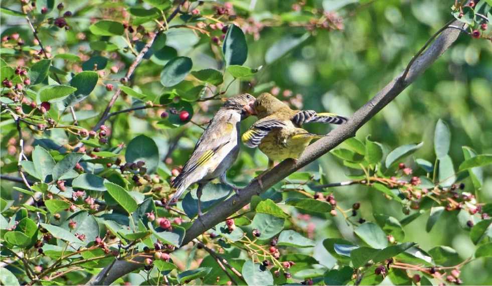 Рис. 13. Самка зеленушки Chloris chloris кормит слётка плодами ирги. Парк Александрино. 16 июля 2025. Фото автора