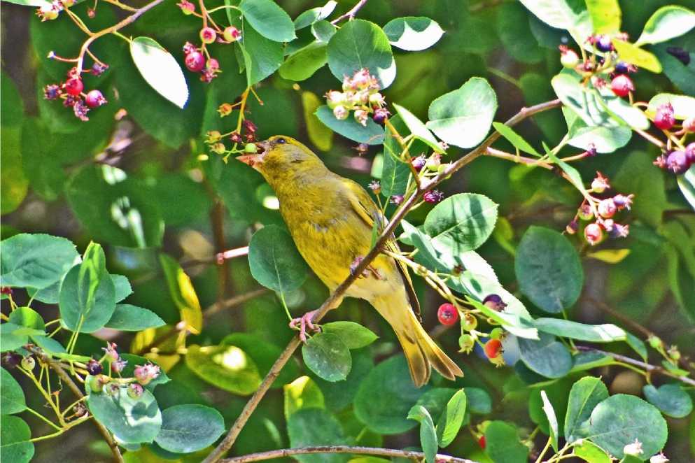 Рис. 14. Самец зеленушки Chloris chloris срывает зелёную «ягоду» ирги. Парк Александрино. 16 июля 2025. Фото автора