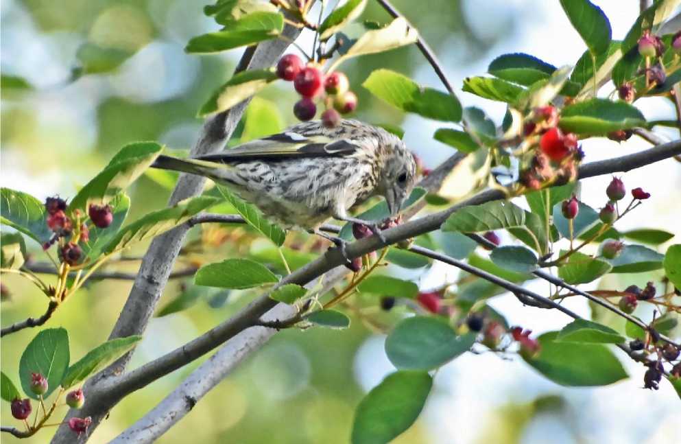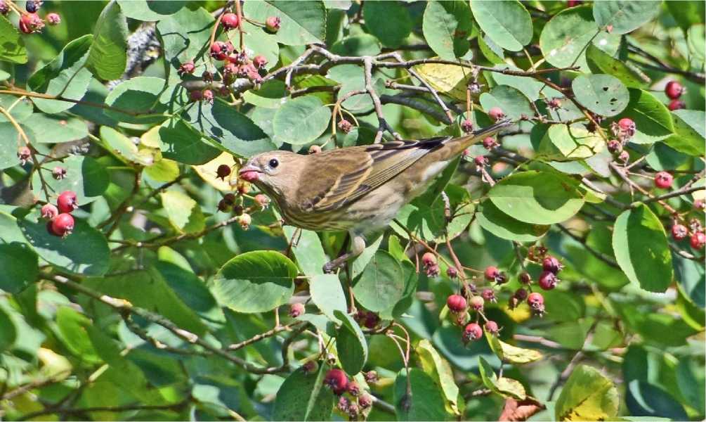 Рис. 15. Самка чечевицы Carpodacus erythrinus ест плоды ирги. Александрино. 16 июля 2025. Фото автора