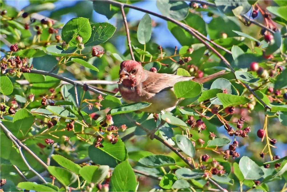 Рис. 16. Самец чечевицы Carpodacus erythrinus ест плоды ирги. Александрино. 17 июля 2025. Фото автора