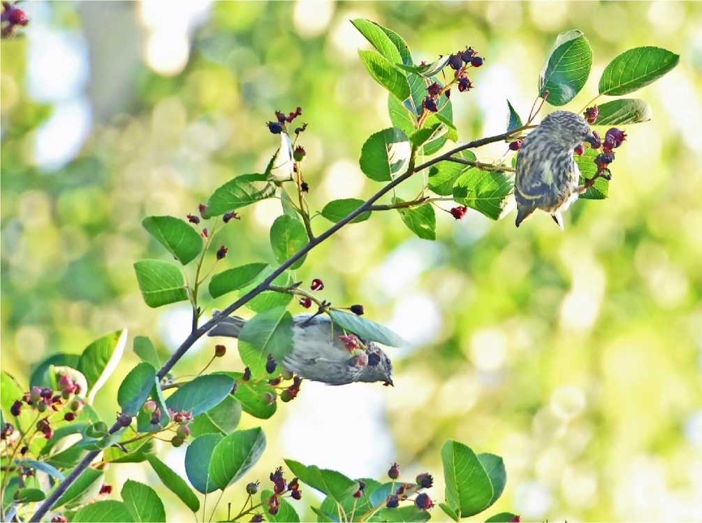 Рис. 17. Чижи Spinus spinus кормятся плодами ирги. Александрино. 17 июля 2025. Фото автора