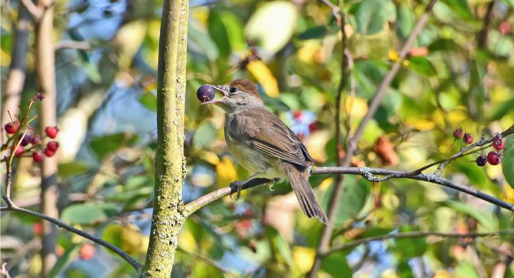 Рис. 19. Самка черноголовой славки Sylvia atricapilla с яблочком ирги. Парк Александрино. 17 июля 2025. Фото автора