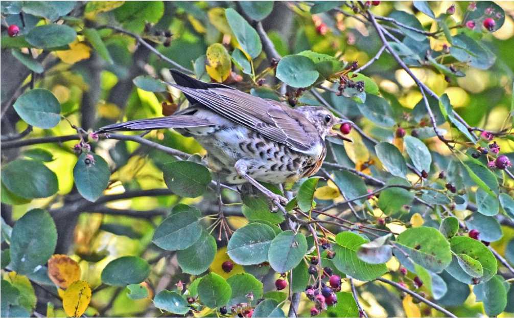 Рябинник Turdus pilaris . Несколько молодых рябинников кормились плодами ирги вместе с дятлами и сороками.