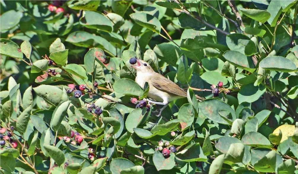 Рис. 21. Садовая славка Sylvia borin глотает яблочко ирги. Александрино. 16 июля 2025. Фото автора