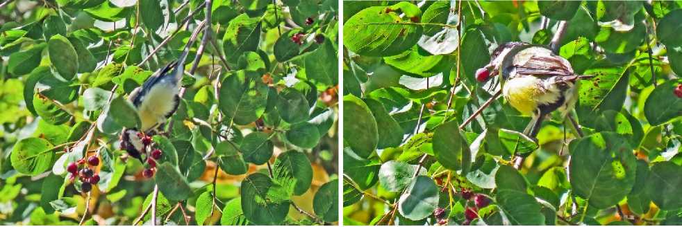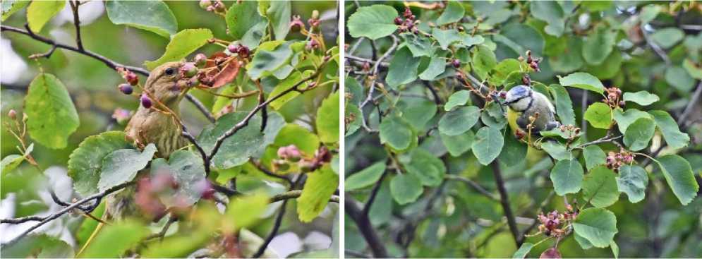 Рис. 22. Зеленушка Chloris chloris и лазоревка Cyanistes caeruleus кормятся плодами ирги обильноцветущей Amelanchier florida . Ботанический сад БИН РАН. Санкт-Петербург. 22 июля 2025. Фото автора