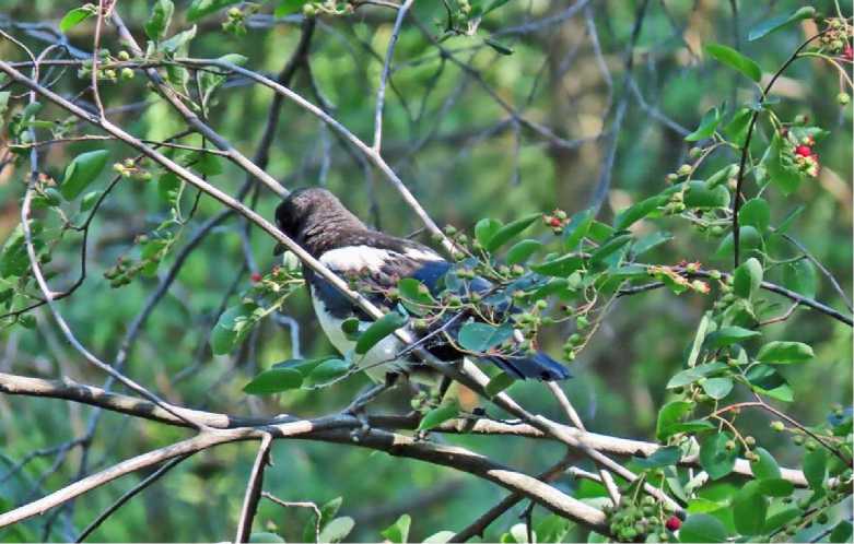 Рис. 24. Сорока Pica pica кормится плодами ирги. Ботанический сад Самарского университета. 9 июня 2023. Фото автора