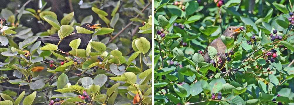 Рис. 4. Чёрные дрозды Turdus merula кормятся плодами ирги. Парк Александрино. 16 (справа) и 19 июля 2025. Фото автора