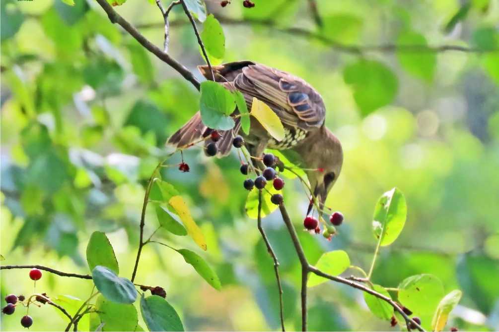 Рис. 5. Молодой скворец Sturnus vulgaris ест плоды ирги. Парк Александрино. 19 июля 2025. Фото автора