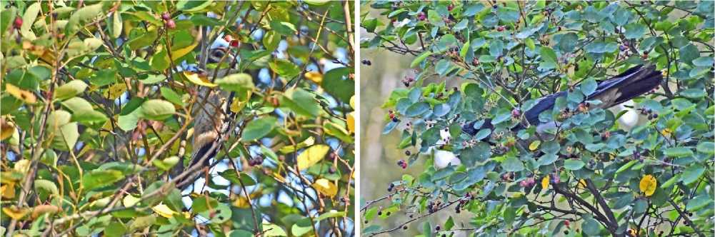 Рис. 6. В кусте ирги во время кормёжки плодами: слева – большой пёстрый дятел Dendrocopos major , 18 июля 2025; справа – серая ворона Corvus cornix , 19 июля 2025. Парк Александрино. Фото автора