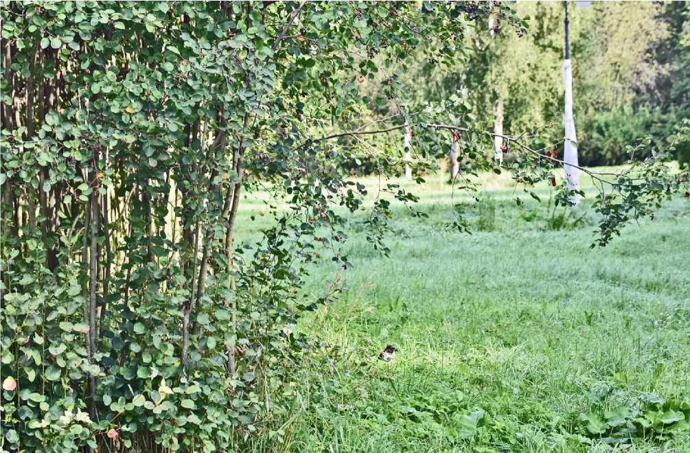 Серая ворона Corvus cornix . Кормилась плодами ирги 19 июля. В последующие дни серые вороны отмечались под кустами ирги, собирающими упавшие плоды в траве (рис. 6, 7).