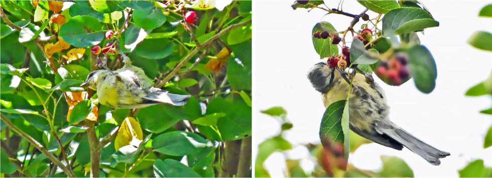 Рис. 9. Молодая лазоревка Cyanistes caeruleus кормится плодами ирги. Парк Александрино. 19 и 20 июля 2025. Фото автора