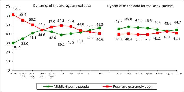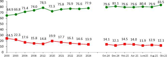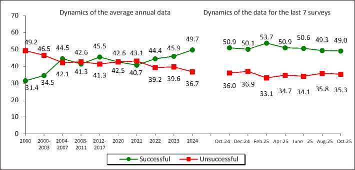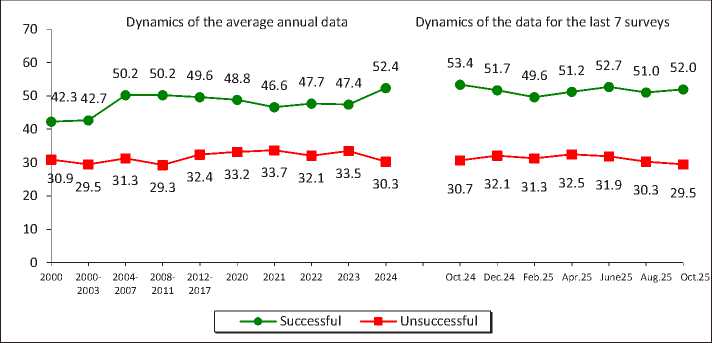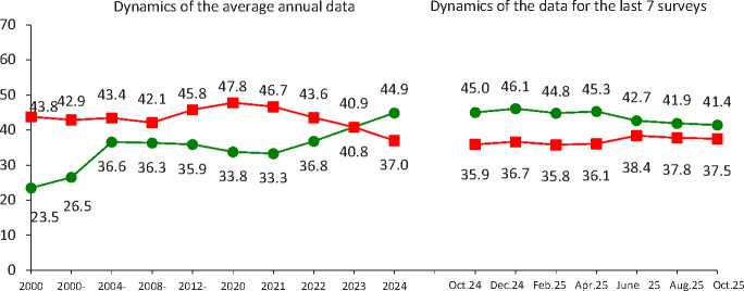 Over the past 12 months (from October 2024 to October 2025), the estimates of the population have remained unchanged: the share of positive judgments is 49–51%, negative – 35–36%.