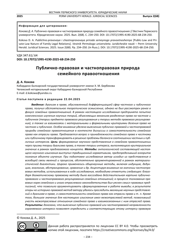 Introduction: legal dualism which is conditioned by the differentiation of the private and public law spheres has been given a thorough theoretical conceptualization but was never considered in the focus of family legal relations. Within the framework of this study, an attempt has been made to comprehensively study scientific theories explaining the mechanism of separation of law into private and public (theories of the legal regulation subject and theories of the legal regulation method), as well as their relationship with the material and formal criteria for dividing law into private and public. Special attention is paid to clarifying the public and private nature of family legal relations in the context of discussing the independence of family law as one of the branches of law. It is proposed to transform the question of including the family law with private or public law into solving the issue of the balance in the private and public interests correlation. The purpose of the study is to develop a scientific understanding of family legal relations through the prism of the theory of dualism of law, as well as the theory of interest having a criterion role within the framework of the proposed concept. Methods: the traditional normativism represented the ontological component of this scientific study and predetermined the algorithm of the research object cognition. In preparing for this study, the author proceeded from the idea of a universal connection between phenomena and processes, which was thoroughly substantiated within the framework of materialistic dialectics. General scientific research methods were widely used, including induction, deduction, analogy, abstraction, comparison, etc. While emphasizing the importance of private-law research methods used in the preparation of this study, the author shall note the following: the actual picture of public-law and private-law regulation of family relations was outlined using the dogmatic legal method; the meaning of legal regulations was clarified in the process of interpreting the legal norms of family and other branch legislation, this allowed to substantiate the conclusions formulated in the work; as a result of relying on the historical and legal method, the author was able to trace the evolution of scientific ideas about dualism in law, about the independence of family law as a branch of law, etc. In addition, the inter-branch method was of great importance for this study since it allowed to account for the inter-branch links between the family law and the related branches of law. Results: it was proved that revealing the public-legal or private-law focus of the protected interest makes it possible to determine the legal nature of family legal relations that corresponds to this interest. Conclusions: the heuristic and methodological significance of dividing law into private and public for modern family law doctrine is clarified; the fundamental impossibility is proved of identifying the family legal relations as those unambiguously having public or private nature; specific examples show the critical importance of interest in determining private or public law effects on public relations; evidence is presented of the independence of the family law as an individual element of the Russian legal system; the real need for a legal definition of the “family» is substantiated.