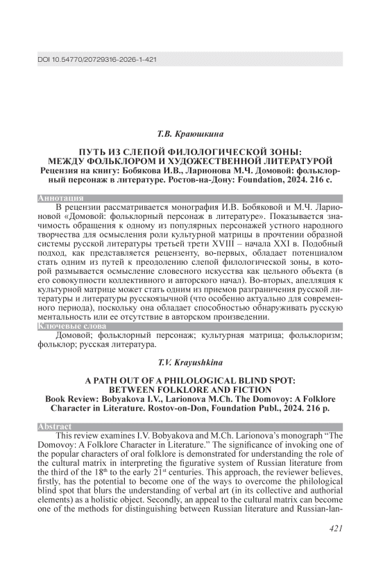 A Path Out of a Philological Blind Spot: Between Folklore and Fiction. Book Review: Bobyakova I.V., Larionova M.Ch. The Domovoy: A Folklore Character in Literature. Rostov-on-Don, Foundation Publ., 2024. 216 p.