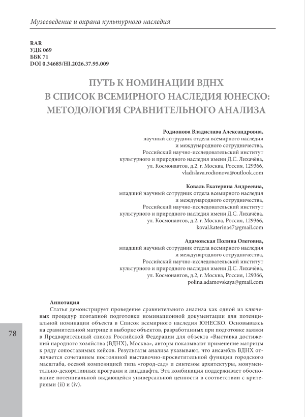 Статья демонстрирует проведение сравнительного анализа как одной из ключевых процедур поэтапной подготовки номинационной документации для потенциальной номинации объекта в Список всемирного наследия ЮНЕСКО. Основываясь на сравнительной матрице и выборке объектов, разработанных при подготовке заявки в Предварительный список Российской Федерации для объекта «Выставка достижений народного хозяйства (ВДНХ), Москва», авторы показывают применение матрицы к ряду сопоставимых кейсов. Результаты анализа указывают, что ансамбль ВДНХ отличается сочетанием постоянной выставочно-просветительной функции городского масштаба, осевой композицией типа «город-сад» и синтезом архитектуры, монументально-декоративных программ и ландшафта. Эта комбинация поддерживает обоснование потенциальной выдающейся универсальной ценности в соответствии с критериями (ii) и (iv).