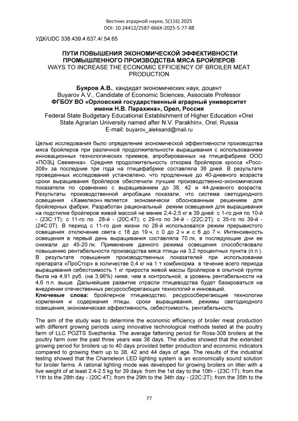 Целью исследования было определение экономической эффективности производства мяса бройлеров при различной продолжительности выращивания с использованием инновационных технологических приемов, апробированных на птицефабрике ООО «ПОЗЦ Свеженка». Средняя продолжительность откорма бройлеров кросса «Росс- 308» за последние три года на птицефабрике составляла 38 дней. В результате проведенных исследований установлено, что продленные до 40-дневного возраста сроки выращивания бройлеров обеспечили лучшие производственно-экономические показатели по сравнению с выращиванием до 38, 42 и 44-дневного возраста. Результаты производственной апробации показали, что система светодиодного освещения «Хамелеон» является экономически обоснованным решением для бройлерных фабрик. Разработан рациональный режим освещения для выращивания на подстилке бройлеров живой массой не менее 2,4-2,5 кг в 39 дней: с 1-го дня по 10-й - (23С:1Т); с 11-го по 28-й - (20С:4Т); с 29-го по 34-й - (22С:2Т); с 35-го по 39-й - (24С:0Т). В период с 11-го дня жизни по 28-й использовался режим прерывистого освещения: отключение света с 18 до 19 ч, с 0 до 2 ч и с 6 до 7 ч. Интенсивность освещения в первый день выращивания составляла 70 лк, в последующие дни ее снижали до 45-20 лк. Применение данного режима освещения способствовало повышению рентабельности производства мяса птицы на 3,2 процентных пункта (п.п.). В результате повышения производственных показателей при использовании препарата «ПроСтор» в количестве 0,4 кг на 1 т комбикорма в течение всего периода выращивания себестоимость 1 кг прироста живой массы бройлеров в опытной группе была на 4,91 руб. (на 3,96%) ниже, чем в контрольной, а уровень рентабельности на 4,6 п.п. выше. Дальнейшее развитие отрасли птицеводства будет базироваться на внедрении отечественных ресурсосберегающих технологий и инноваций.