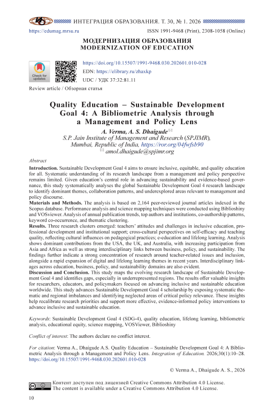Введение. Цель устойчивого развития 4 направлена на обеспечение инклюзивного, справедливого и качественного образования. Несмотря на возрастающий научный интерес к вопросам образования в контексте устойчивого развития, системное понимание ландшафта исследований с точки зрения управления и политики остается ограниченным. Цель исследования – проанализировать глобальный исследовательский ландшафт цели устойчивого развития 4 для выявления доминирующих тем, моделей сотрудничества и пробелов, имеющих отношение к управленческому и политическому дискурсу. Материалы и методы. Осуществлен анализ 2 164 статей из рецензируемых журналов, индексируемых в Scopus, с помощью структурированного поиска. Научное картирование было проведено с использованием программных инструментов Biblioshiny и VOSviewer. Процесс библиометрии включал изучение годовых тенденций публикаций ведущих авторов и организаций, моделей соавторства, со-встречаемости ключевых слов и тематического кластерного анализа для отслеживания интеллектуальной структуры и возникающих тем в исследуемой области. Результаты исследования. Выделены три исследовательских кластера: отношение преподавателей и проблемы инклюзивного образования с акцентом на профессиональное развитие и институциональную поддержку; межкультурные перспективы самоэффективности и качества преподавания, отражающие влияние культуры на педагогическую практику; электронное образование и обучение на протяжении всей жизни, подчеркивающее роль цифровых платформ в расширении доступа к образованию. Установлены доминирующий вклад США, Великобритании и Австралии при растущем участии Азии и Африки, а также прочные междисциплинарные связи между бизнесом, политикой и устойчивым развитием. Отмечается сильная концентрация работ вокруг вопросов, касающихся учителей и инклюзии, наряду с быстрым расширением тем цифрового и непрерывного обучения в последние годы. Обсуждение и заключение. Исследование отображает эволюцию исследовательского ландшафта в области цели устойчивого развития 4 и выявляет пробелы. Результаты предлагают ценные идеи для исследователей, педагогов и политиков, стремящихся продвигать инклюзивное и устойчивое образование во всем мире.