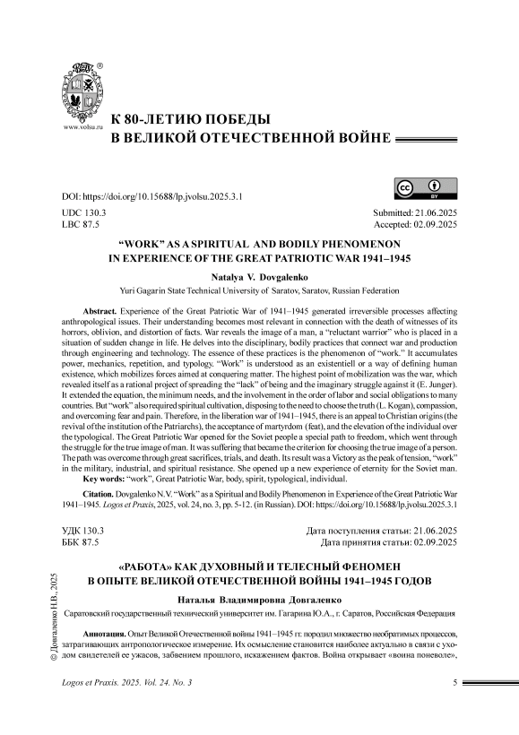 Опыт Великой Отечественной войны 1941–1945 гг. породил множество необратимых процессов, затрагивающих антропологическое измерение. Их осмысление становится наиболее актуально в связи с уходом свидетелей ее ужасов, забвением прошлого, искажением фактов. Война открывает «воина поневоле», поставленного в ситуацию внезапного изменения жизненного мира. Он погружается в дисциплинарные, телесные практики, соединившие поле битвы и поле производства, технику и технологию. Их ядром становится феномен «работы», сосредоточивший в себе силу, механицизм, стихийность места, типическое повторение и пр. «Работа» стала экзистенциалом или способом определения человеческого существования, мобилизуя усилия воина-работника, направленные на власть над материей. Высшей точкой выражения этих полей явилась война, раскрывшаяся как рациональный проект распространения «недостатка» бытия и мнимой борьбы с ним (Э. Юнгер). Их выражением стало стремление к уравниванию, минимализации потребностей, вовлечению в порядок трудовой, социальной повинности. Однако «работа» потребовала и духовного возделывания, располагая к необходимости выбора истины (Л. Коган), страданию и состраданию, преодолению страха, боли. Потому в освободительной войне 1941–1945 гг. присутствует невероятное обращение к христианским истокам (возрождение института патриаршества), принятие мученичества в форме подвига, возвышение индивидуального над типологическим. Великая Отечественная война открыла для советского человека особый путь к обретению свободы, который претворился через выбор собственного истинного образа. Именно страдание стало критерием выбора. Путь был пройден через огромные жертвы, испытания и смерть. Его конечным пунктом стала Победа как пик напряжения, «работы» в военном, производственном и духовном сопротивлении, открывшая новый опыт вечности для советского человека.