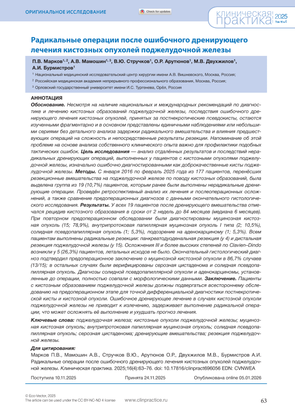 Обоснование. Несмотря на наличие национальных и международных рекомендаций по диагностике и лечению кистозных образований поджелудочной железы, последствия ошибочного дренирующего лечения кистозных опухолей, принятых за постнекротические псевдокисты, остаются изученными фрагментарно и в основном представлены единичными наблюдениями или небольшими сериями без детального анализа задержки радикального вмешательства и влияния предшествующих операций на сложность и непосредственные результаты резекции. Напоминание об этой проблеме на основе анализа собственного клинического опыта важно для профилактики подобных тактических ошибок. Цель исследования — анализ отдалённых результатов и последствий нерадикальных дренирующих операций, выполненных у пациентов с кистозными опухолями поджелудочной железы, изначально ошибочно диагностированными как доброкачественные кисты поджелудочной железы. Методы. С января 2016 по февраль 2025 года из 177 пациентов, перенёсших резекционные вмешательства на поджелудочной железе по поводу кистозных образований, была выделена группа из 19 (10,7%) пациентов, которым ранее были выполнены нерадикальные дренирующие операции. Проведён ретроспективный анализ их лечения и послеоперационных осложнений, а также сравнение предоперационных диагнозов с данными окончательного гистологического исследования. Результаты. У всех 19 пациентов после дренирующего вмешательства отмечался рецидив кистозного образования в сроки от 2 недель до 84 месяцев (медиана 6 месяцев). При повторном предоперационном обследовании были диагностированы муцинозная кистозная опухоль (15; 78,9%), внутрипротоковая папиллярная муцинозная опухоль I типа (2; 10,5%), солидная псевдопапиллярная опухоль (1; 5,3%), подозрение на аденокарциному (1; 5,3%). Всем пациентам выполнены радикальные резекции: панкреатодуоденальная резекция (у 4) и дистальная резекция поджелудочной железы (у 15). Осложнения III и более высоких степеней по Clavien–Dindo возникли у 5 (26,3%) пациентов, летальных исходов не было. Окончательный гистологический диагноз подтвердил предоперационное заключение о муцинозной кистозной опухоли в 86,7% случаев (13/15); в остальных случаях были верифицированы серозная цистаденома и солидная псевдопапиллярная опухоль. Диагнозы солидной псевдопапиллярной опухоли и аденокарциномы, установленные до операции, полностью совпали с морфологическими данными. Заключение. Пациенты с кистозным образованием поджелудочной железы должны подвергаться всестороннему обследованию на предоперационном этапе для точной дифференциальной диагностики постнекротической кисты и кистозной опухоли. Ошибочное дренирующее лечение в случаях кистозной опухоли поджелудочной железы не приводит к излечению, задерживает выполнение радикальной операции, что может осложнять её выполнение и ухудшать прогноз лечения.
