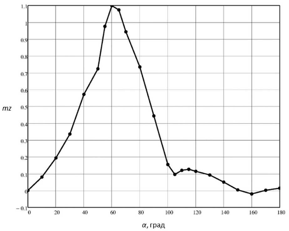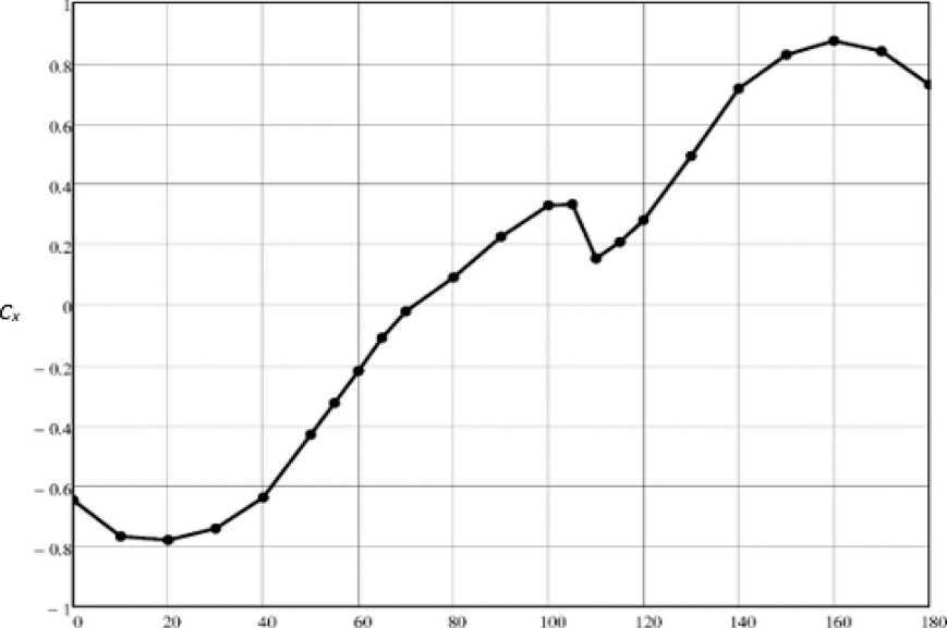 Основной целью настоящей работы является расчёт для блока аэродинамических коэффициентов продольной силы Cx, нормальной силы Cy и продольного момента mz для различных углов атаки α. Соответствующие графики приведены на рисунках 8–10. Следует отметить, что угол атаки α здесь варьировался в диапазоне от 0 до 180° с шагом 10°, а при резком изменении аэродинамических коэффициентов – с шагом 5°. Как видно из представленных рисунков, при угле атаки α = 60° коэффициент аэродинамической нормальной силы, а также коэффициент аэродинамическо- го продольного момента достигают максимальных значений. Кроме того, в районе угла α = 110° наблюдается резкое изменение коэффициента аэродинамической продольной силы.