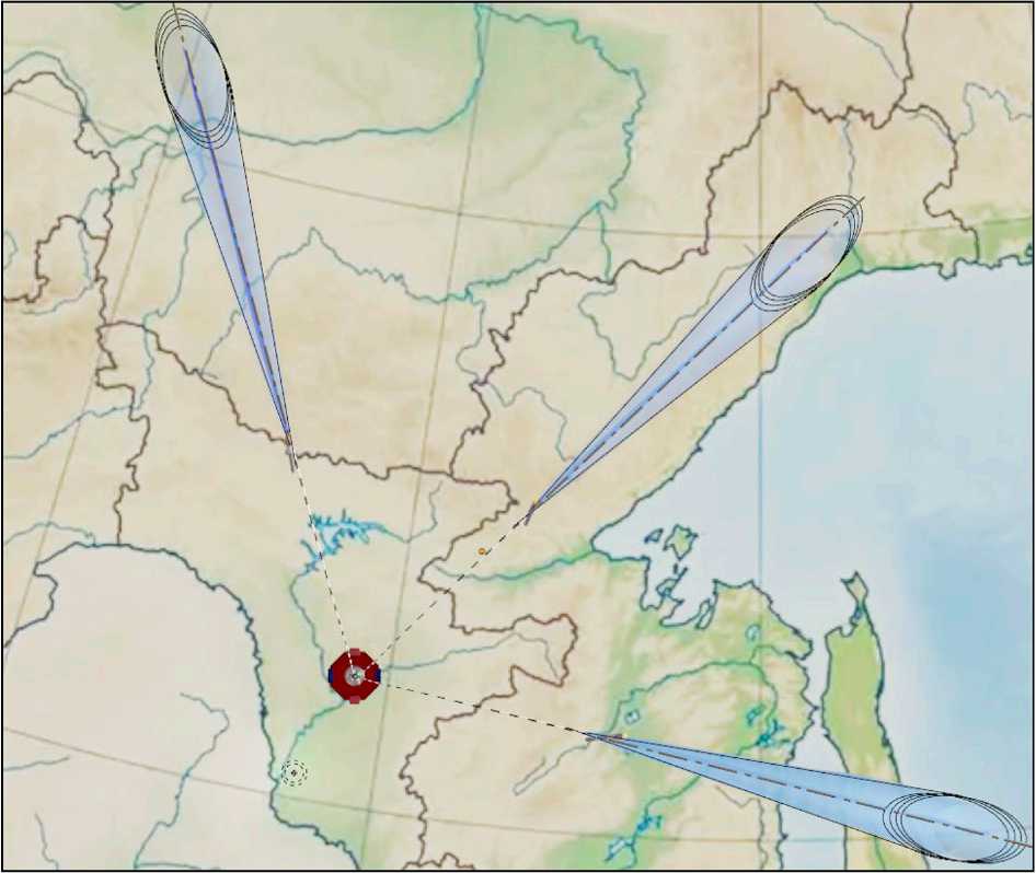 Рисунок 15. Траектории и районы падения в объемном представлении на карте Дальнего Востока (пунктиром показана траектория выведения, светлым – рассчитанная траектория падения блока)