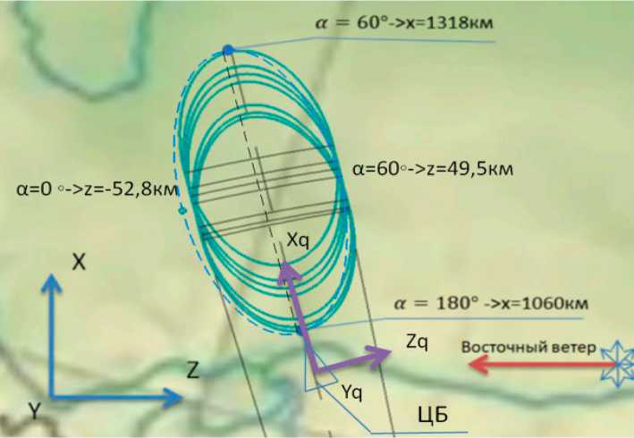 объект исследования) отделяется в момент времени 287.7 с. РН в этот момент имеет скорость 3750, высоту 145 км и дальность 450 км [8]. На основании представленного алгоритма моделирования возмущенного движения были получены районы падения, учитывающие форму блока и условия обтекания его потоками воздушных масс с различными углами атаки (рисунки 13–15).