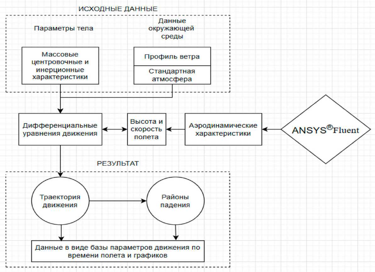 Новизна предложенного алгоритма заключается в интеграции вычислительной гидродинамики с интегрированием уравнений движения в реальном времени, что позволяет динамически учитывать аэродинамические изменения на каждом шаге, повышая точность предсказания зон падения по сравнению с фиксированными коэффициентами. Кроме того, алгоритм включает учет упругих деформаций центрального блока через расчеты в Ansys Workbench, что добавляет полноту моделирования, отсутствующую в стандартных подходах с шестью степенями свободы. Модульная архитектура упрощает интеграцию с существующими моделями, делая метод более эффективным для экологической оптимизации. Эти особенности отличают алгоритм от текущих решений, где вычислительная гидродинамика обычно применяется в предварительных расчетах, и могут способствовать улучшению точности в предсказании траекторий.