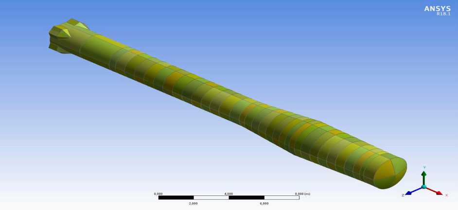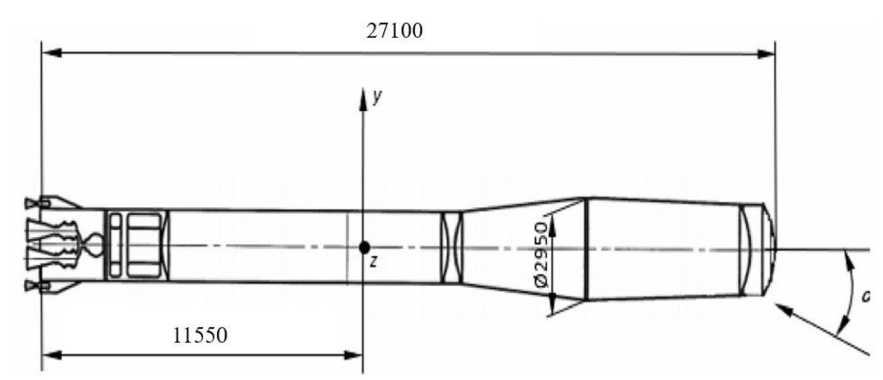 Для вычисления аэродинамических характеристик отделяемого блока ракеты-носителя в программе Fluent применяется связанная система координат, начало которой располагается в центре масс рассматриваемого блока (расположенном на расстоянии 11.55 м от нижнего среза корпуса блока). При этом ось x направляется вдоль оси блока в сторону верхней опоры, ось y – в сторону воздушного руля, а ось z проводится так, чтобы получилась правая система координат (рисунок 1). Влиянием фермы на аэродинамику блока прене-брегается.