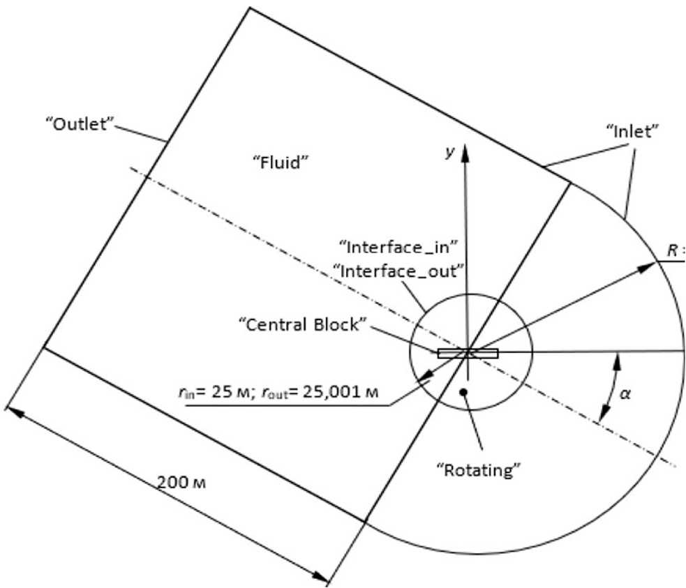 Далее выполняется построение шара газообразной среды, окружающего блок, радиусом r in 25 м и с центром в начале координат. И, наконец, на завершающем этапе выполняется булева операция вычитания (Subtract) объёма блока из шара. Построенному таким образом полому объёму присваивается имя «Rotating», и для него в качестве материала выбирается Fluid . Затем, собственно, для моделирования расчётной области газообразной среды генерируются цилиндр и полушар со сферическим вырезом. Как известно, для корректного задания граничных условий размеры расчётной области должны быть достаточно большими [1]. Учитывая этот факт, длина цилиндра принята равной 200 м, а радиусы цилиндра и полушара R = 120 м (рисунок 3). Радиус сферического выреза составляет r out = 25.001 м, что на 1 мм больше r in. Здесь угол атаки α выбирается в качестве проектного параметра, что позволяет легко изменять его значение.