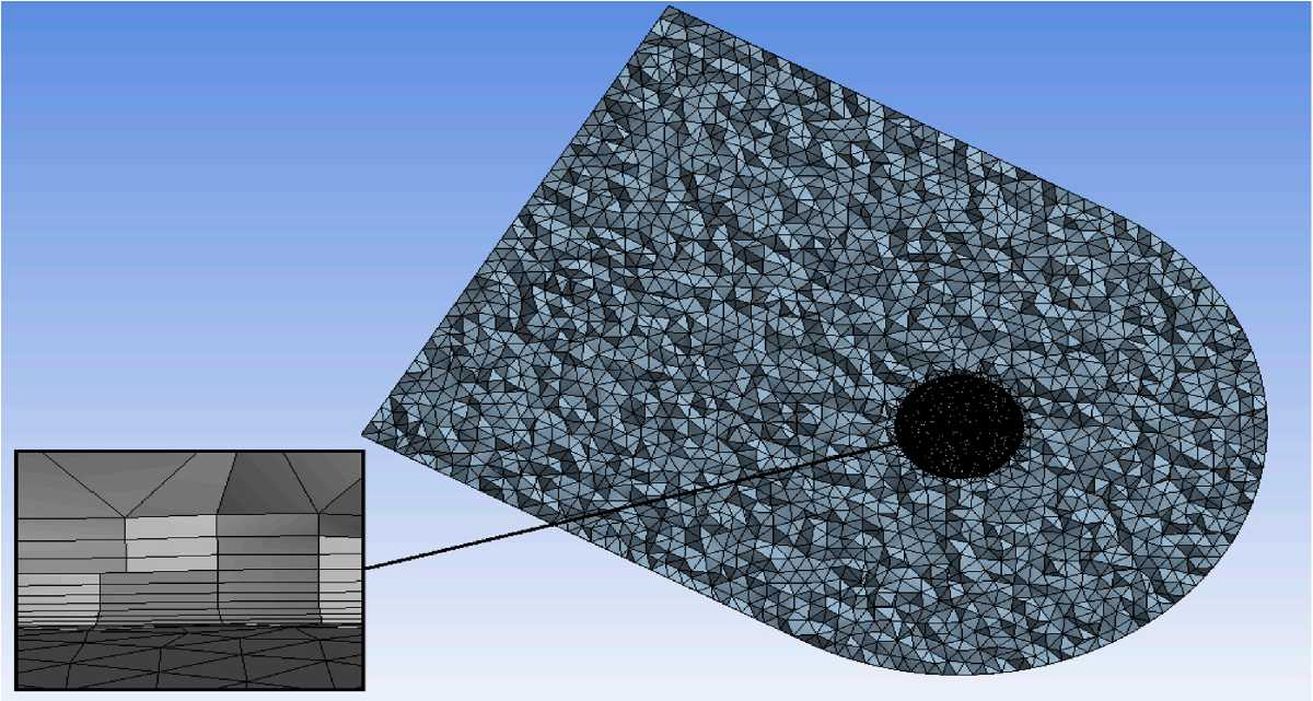 Для определения параметров сетки на отдельных частях геометрической модели (рёбрах, гранях, объёмах) можно воспользоваться локальными настройками. В нашем случае для поверхностей из именованных выборок задаются следующие размеры расчётных ячеек: «CentralBlock» – 0,1 м; «Interface_in» – 1 м; «Interface_out» – 2 м. Построенная сетка представлена на рисунке 4, где для удобства изображения показано сечение плоскостью xy и сделана выноска, демонстрирующая слои расчётных ячеек, окружающие блок.