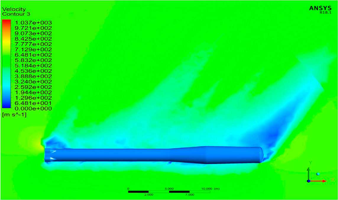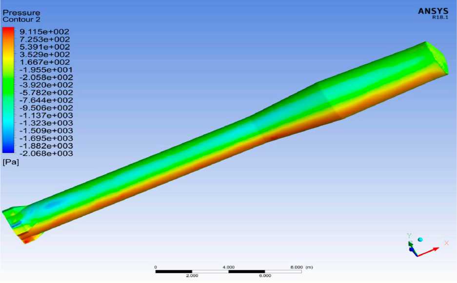 Далее в качестве примера представлены некоторые результаты для угла атаки α = 115°. Так, на рисунке 6 показано распределение скорости в плоскости xy . Видно, что максимальная скорость равна 1037 м/с, причём скорость невозмущённого потока составляет 634.378 м/с. На рисунке 7 изображено распределение давления по поверхности блока. Как видно, давление изменяется в пределах от минус 2068 до 911.5 Па.
