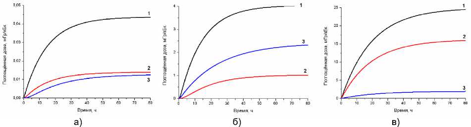 С использованием данных табл. 1 по формулам (9) рассчитывались накопленные к определённому моменту времени и полные поглощённые дозы в органах и тканях мышей от 188Re-МСА. В качестве примера на рис. 2 приведены накопленные поглощённые дозы в некоторых органах, рассчитанные при разных путях введения РФЛП: 1 – внутривенный, 2 – внутримышечный, 3 – внутриопухолевый. Органом-мишенью являются органы с максимальным депонированием 188Re-МСА: лёгкие, мышца бедра и опухоль соответственно.