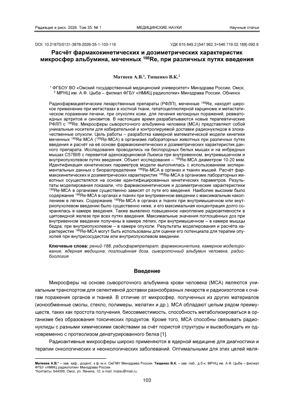 Радиофармацевтические лекарственные препараты (РФЛП), меченные 188Re, находят широкое применение при метастазах в костной ткани, гепатоцеллюлярной карциноме и метастатическом поражении печени, при опухолях кожи, для лечения келоидных поражений, ревматоидных артритов и синовитов. В настоящее время разрабатываются новые терапевтические РФЛП с 188Re. Микросферы сывороточного альбумина человека (МСА) представляют собой уникальные носители для избирательной и контролируемой доставки радионуклидов в злокачественные опухоли. Цель работы – разработка камерной математической модели кинетики меченных 188Re МСА (188ReМСА) в организме лабораторных животных при различных путях введения и расчёт на её основе фармакокинетических и дозиметрических характеристик данного препарата. Исследования проводились на беспородных белых мышах и на инбредных мышах C57Bl/6 с перевитой аденокарциномой Льюиса при внутривенном, внутримышечном и внутриопухолевом путях введения. Объект исследования – 188ReМСА диаметром 1020 мкм. Идентификация кинетических параметров модели выполнялась с использованием экспериментальных данных о биораспределении 188ReМСА в органах и тканях мышей. Расчёт фармакокинетических и дозиметрических характеристик 188ReМСА в организме лабораторных животных осуществлялся на основе идентифицированных кинетических параметров. Результаты моделирования показали, что фармакокинетические и дозиметрические характеристики 188ReМСА в организме существенно зависят от пути его введения. Наиболее высоким было содержание 188ReМСА в органах и тканях при внутривенном введении с максимальным накоплением в лёгких. Содержание 188ReМСА в органах и тканях при внутримышечном или внутриопухолевом введении было существенно ниже, и его максимальная концентрация долго сохранялась в камере введения. Также выявлено повышенное накопление радиоактивности в щитовидной железе при всех путях введения. Максимальные значения поглощённых доз при внутривенном введении получены в камере лёгких, при внутримышечном – в камере мышцы бедра, при внутриопухолевом – в камере опухоли. Результаты моделирования и расчёта характеристик 188ReМСА могут быть использованы для оценки его потенциала для терапии опухолей при внутрисосудистом или внутриопухолевом введении.