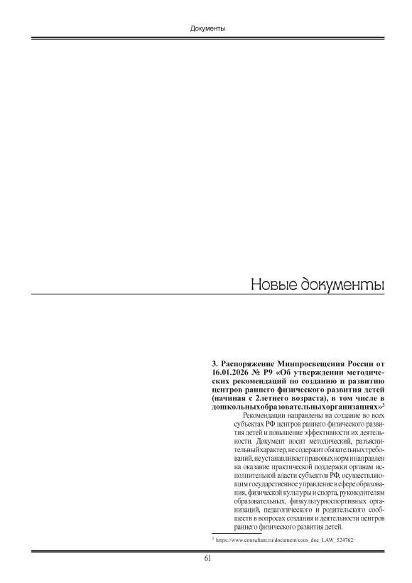 Распоряжение Минпросвещения России от 16.01.2026 № Р9 «Об утверждении методических рекомендаций по созданию и развитию центров раннего физического развития детей (начиная с 2летнего возраста), в том числе в дошкольных образовательных организациях»