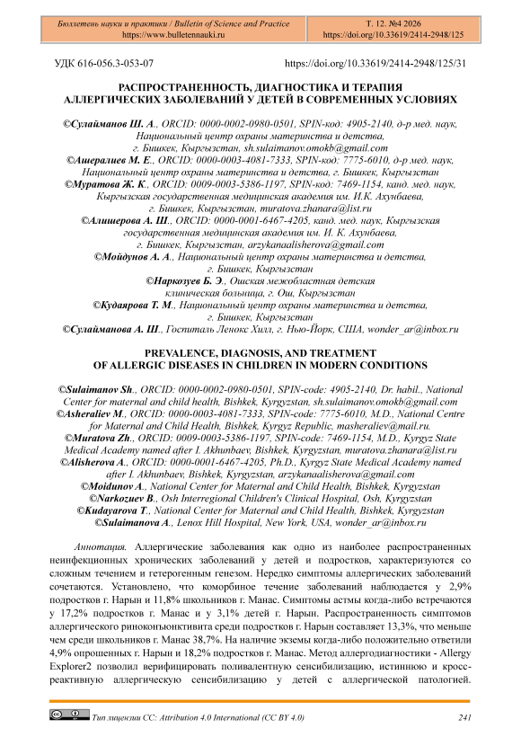 Аллергические заболевания как одно из наиболее распространенных неинфекционных хронических заболеваний у детей и подростков, характеризуются со сложным течением и гетерогенным генезом. Нередко симптомы аллергических заболеваний сочетаются. Установлено, что коморбиное течение заболеваний наблюдается у 2,9% подростков г. Нарын и 11,8% школьников г. Манас. Симптомы астмы когда-либо встречаются у 17,2% подростков г. Манас и у 3,1% детей г. Нарын. Распространенность симптомов аллергического риноконъюнктивита среди подростков г. Нарын составляет 13,3%, что меньше чем среди школьников г. Манас 38,7%. На наличие экземы когда-либо положительно ответили 4,9% опрошенных г. Нарын и 18,2% подростков г. Манас. Метод аллергодиагностики - Allergy Explorer2 позволил верифицировать поливалентную сенсибилизацию, истиннюю и кросс-реактивную аллергическую сенсибилизацию у детей с аллергической патологией. Международные программы Global Initiative for asthma, Global Asthma Network, Allergic Rhinitis and Its Impact on Asthma (2025) рекомендуют применения комбинированной терапии ингаляционными глюкокортикостероидами и длительно-действующими β2-агонистами, генно-инженерных иммунобиологических препаратов при бронхиальной астме и комбинированных интраназальные спреев с антигистаминными препаратами и кортикостероидами при аллергическом риноконъюнктивите, а также топических противовоспалительных, нестероидных средства. Реализация образовательных программ среди детей и их родителей имеет важное значение.