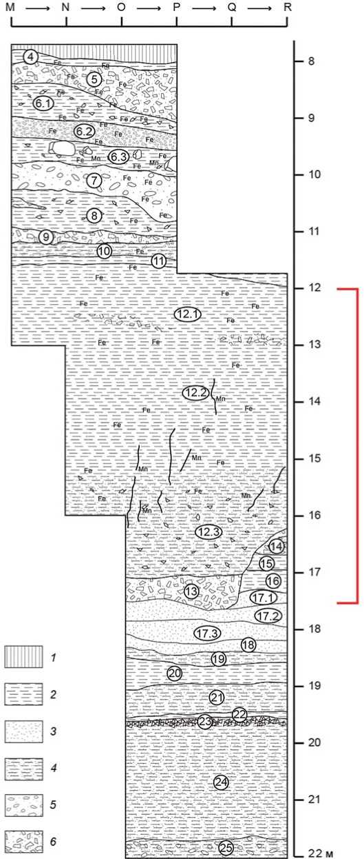 Вторая пачка – слои 21–18. Она представляет собой чередующиеся пролювиально-селевые осадки с тонкими прослоями озерных суглинков серого и сизого цвета. Эти отложения формировались во время похолодания МИС 6.