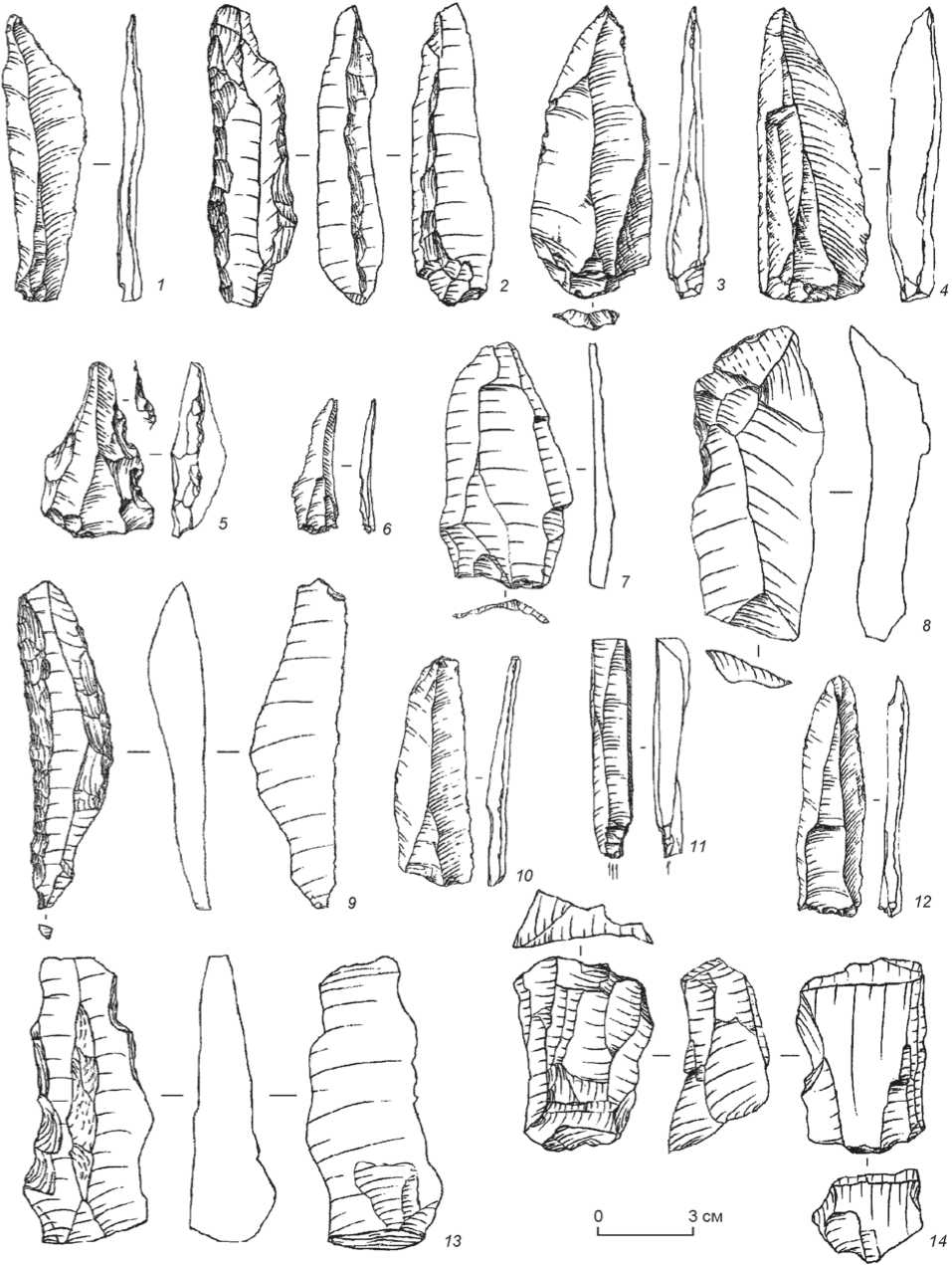 6 , 8 , 10 , 12 - пластины со следами использования; 11 - резец; 14 - нуклеус.