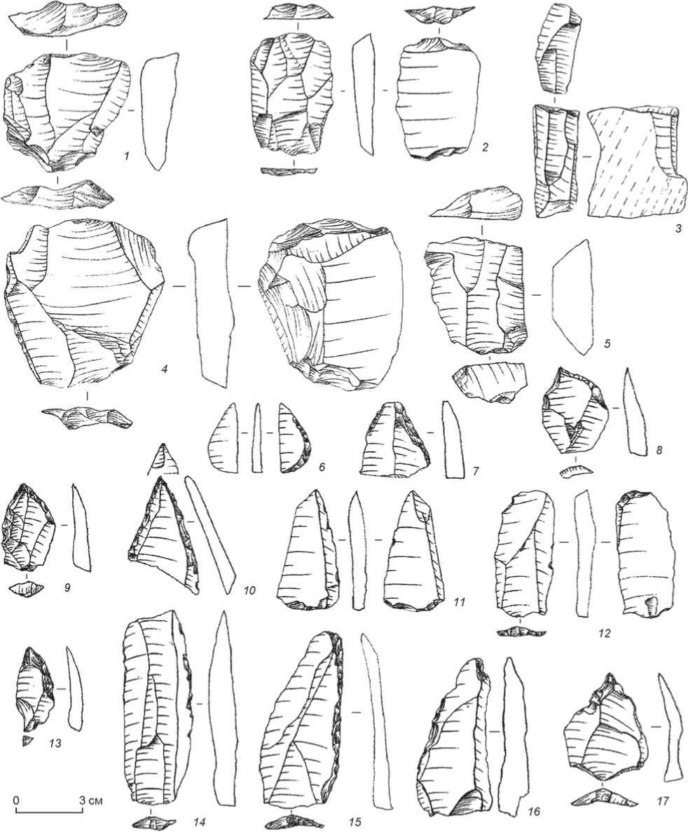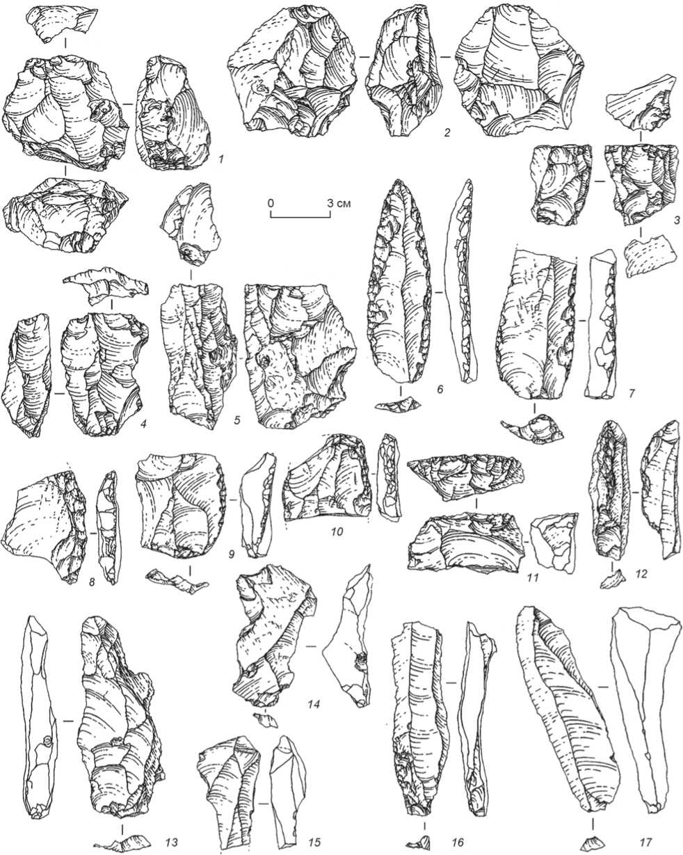 1 , 4 - леваллуазские нуклеусы; 2 - фронтальный скол с нуклеуса со следами встречного расщепления; 3 - торцовый нуклеус для получения пластинок и микропластинок; 5 - плоскостной нуклеус; 6 - нож с обушком; 7 , 10 - фрагменты остроконечников; 8 , 17 - проколки; 9 , 13 - скреблышки с ретушированным острием; 11 - пластина со следами подтески; 12 - скребок; 14 - пластина с эпизодической ретушью;