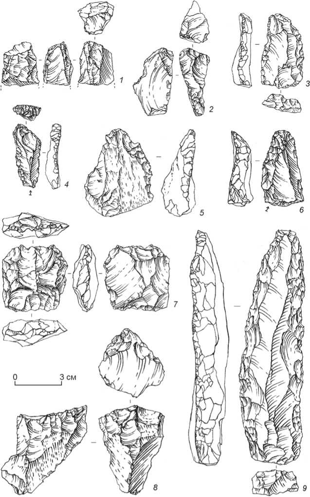 1 , 2 , 7 , 8 - нуклеусы; 3 , 4 , 6 - скребки; 5 - нож с обушком-гранью; 9 - скребловидное орудие на пластине.