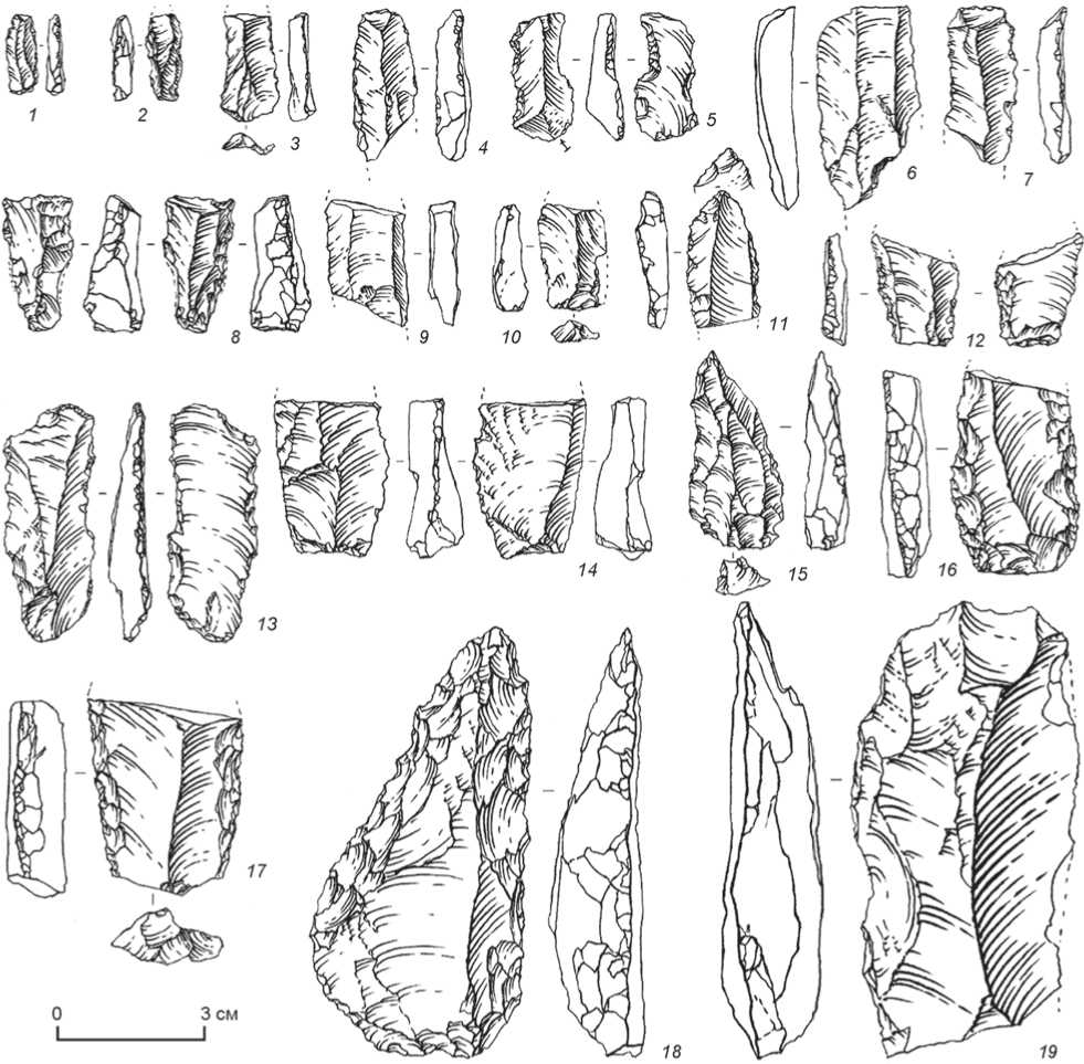 Рис. 7. Каменный инвентарь из слоя 21 местонахождения Оби-Рахмат (по: [Деревянко, Кривошапкин, Анойкин и др., 2004]). 1-3 , 15 - скребла-проколки; 4 , 12 , 14 , 17 , 18 - скребла; 5 , 19 - пластины с эпизодической ретушью; 6 , 13 , 16 - пластины; 7-11 - микропластинки.