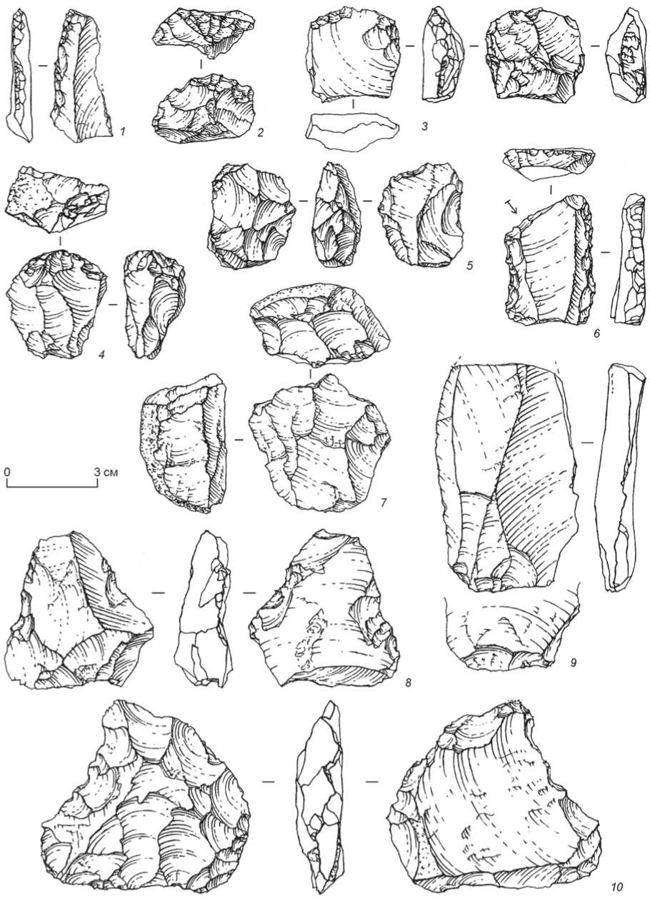 1 , 6 - скребла; 2 - скребок; 3 - долотовидное изделие; 4 , 5 , 7 - нуклеусы; 8 - отщеп с ретушью; 9 - тронкированно-фасетированное изделие; 10 - унифас.
