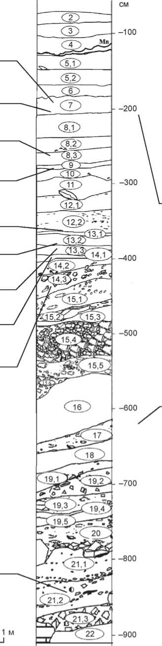 В 1998 г. начался второй этап исследований грота Оби-Рахмат. Он проводился сотрудниками Института археологии и этнографии СО РАН и Института археологии Национальной академии наук Узбекистана (научные руководители A.П. Деревянко и У.И. Исламов; начальником отряда вначале был B.Т. Петрин, а с 2001 г. по настоящее время работами руководит А.И. Кривошапкин). На втором этапе полевых работ удалось почти полностью исследовать рыхлое заполнение грота и получить большое количество материалов, значительная часть которых была опубликована. В процессе исследований толща рыхлого заполнения мощностью ок. 10 м была разделена на 22 литологических слоя, вмещающих 36 культуросодержащих горизонтов с разной степенью насыщенности археологическими материалами: от нескольких десятков в слое 16 до десятков тысяч в слое 19 (рис. 6).